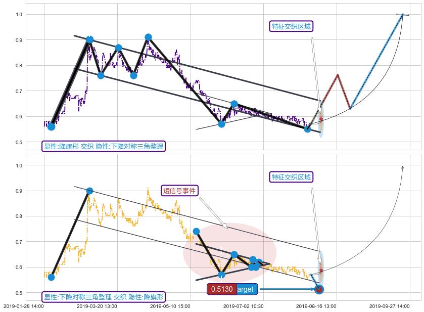 ➢ 下降对称三角整理属【短级别信号事件】降旗形属【长级别信号事件】长短周期组合信号事件, 短长事件长度比25.88%