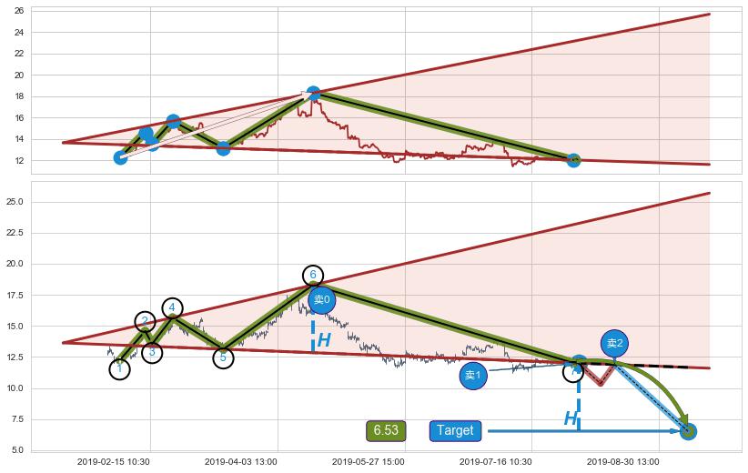从2019-05-23 14:00至2019-06-13 09:30,共包含81个小时,阶段股价上涨2.84%,阶段股价变动位移路程比: 1 : 19
