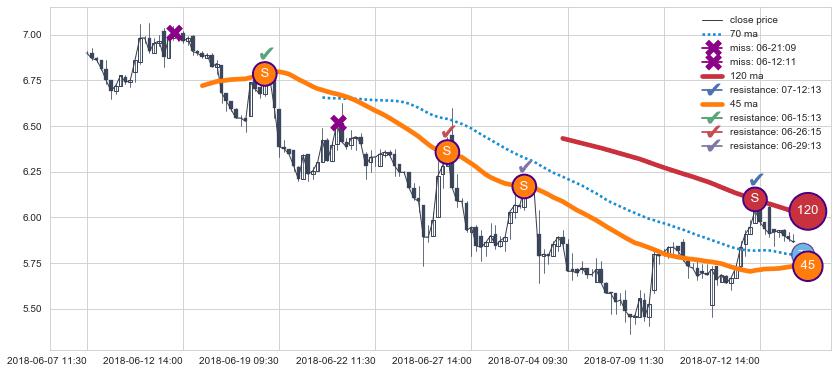 04-23 13:00至06-17 10:30 慢线与快线呈空头排列, 慢线与快线接触少,无缠绕