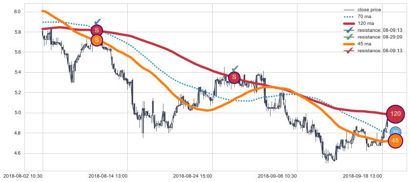 ➢ 最优均线组合共正确确认支撑阻力信号17处,正确确认率 65.38%