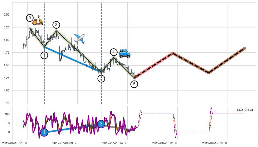 ➣ 第一, 三驱动浪端点:【KDJ】走势出现【常规背离 & 反转信号】背离程度85.29%,背离夹角角度76.1˚,背离程度较小
