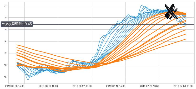 ➣ 60小时均线于(07-25 14:00: 20.52)形成【死叉】基于【死叉历史模型】预测死叉后最低波谷价格: 19.31, 死叉后最低价格19.06,虽然已经到达预测最低波谷价格,但耗时间很短动能很强, 预期继续下跌