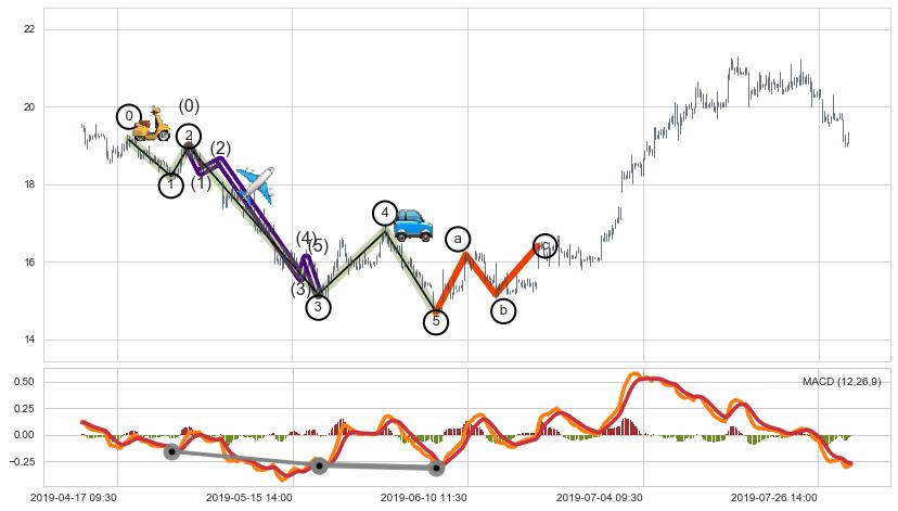 从2019-05-20 10:30至2019-06-13 09:30,共包含102个小时,阶段股价上涨0.60%,阶段股价变动位移路程比: 1 : 124