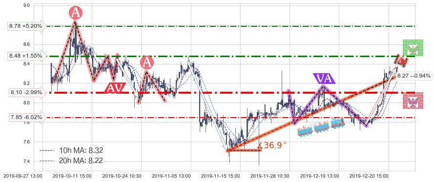 ♘ 阻力价格位8.48,可信任强度68.46%,距离最后交易2019-12-24 11:30形成的收盘价格8.35相差 +1.55%