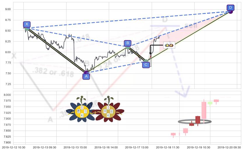➢ 谐波螃蟹:b下跌接近c:猜想支撑性拉升 → 上涨 →【拐点】支撑临近 → 大趋势均值回复