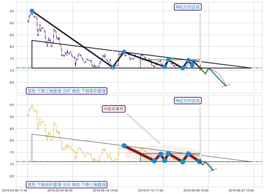 ➣ 顶部尽头线(下山虎) + 下跌矩形整理临近支撑猜想转换阻力下跌信号叠加后【信号初始稳固度】中等,【看空】信号叠加【可信度影响中等】