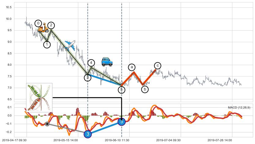 从2019-05-27 09:30至2019-06-17 11:30,共包含87个小时,阶段股价上涨0.45%,阶段股价变动位移路程比: 1 : 134