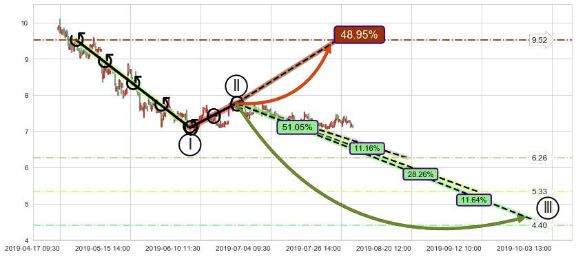 从2019-04-10 09:30至2019-06-17 10:30,共包含260个小时,阶段股价下跌-33.08%,阶段股价变动位移路程比: 1 : 6,下跌趋势角度: 56.7