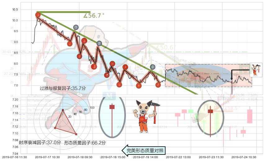 从2019-06-20 15:00至2019-07-16 09:30,共包含98个小时,阶段股价下跌-4.20%,阶段股价变动位移路程比: 1 : 12,下跌趋势角度: 53.7