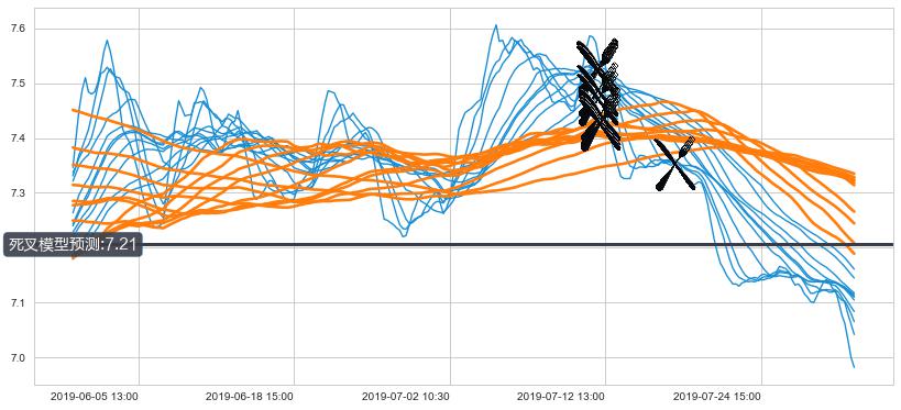 ➣ 80小时均线于(07-12 10:30: 7.43)形成【死叉】基于【死叉历史模型】预测死叉后最低波谷价格: 7.22, 死叉后最低价格6.95,已经下跌超出预测最低波谷价格, 预期反弹