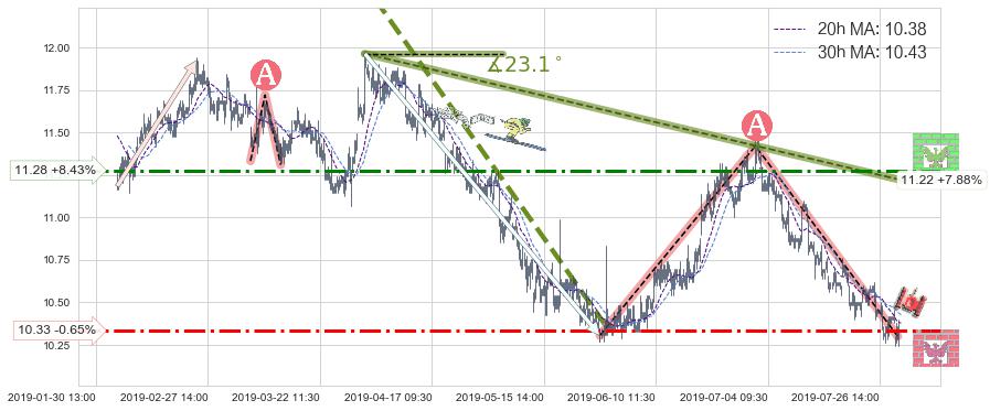 ♘ 阻力价格位11.28,可信任强度60.95%,距离最后交易2019-07-31 15:00形成的收盘价格10.40相差 +8.43%