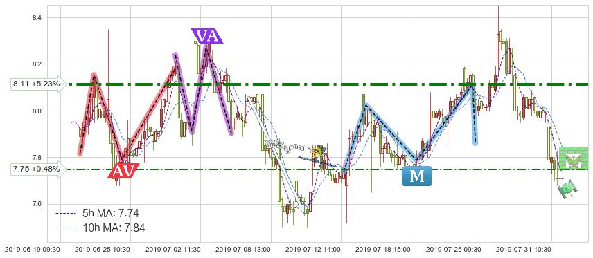 ♘ 阻力价格位7.75,可信任强度42.59%,距离最后交易2019-07-31 15:00形成的收盘价格7.71相差 +0.48%