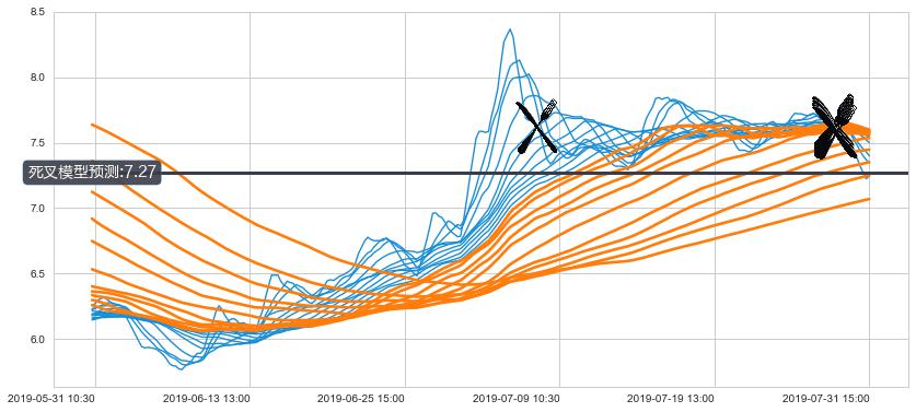 ➣ 80小时均线于(07-29 15:00: 7.60)形成【死叉】基于【死叉历史模型】预测死叉后最低波谷价格: 7.30, 死叉后最低价格7.17,已经下跌超出预测最低波谷价格, 预期反弹