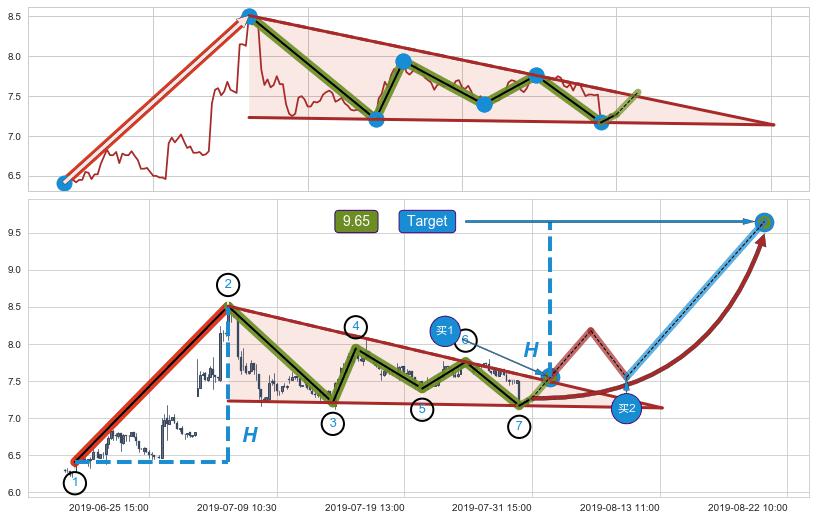 ➢ 最小中继整理涨幅→𝐇: 2.100 (𝐇楔型旗杆的长度:楔型起点→顶点)