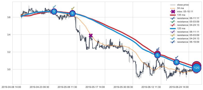 ➢ 最优均线组合共正确确认支撑阻力信号16处,正确确认率 76.19%