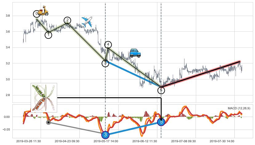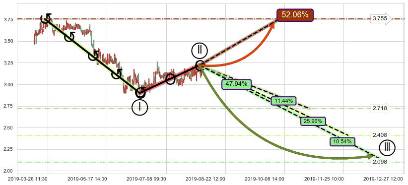 从2019-05-31 13:00至2019-06-28 15:00,共包含117个小时,阶段股价上涨9.55%,阶段股价变动位移路程比: 1 : 9