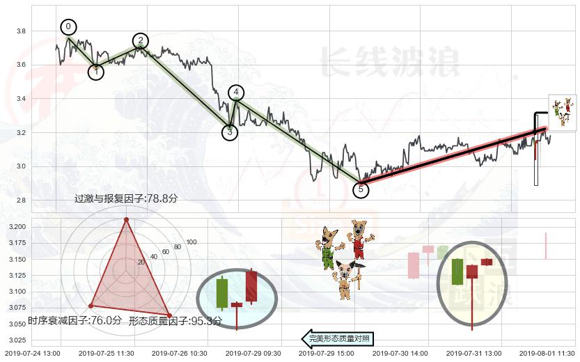 从2019-07-17 09:30至2019-08-02 15:00,共包含78个小时,阶段股价上涨6.12%,阶段股价变动位移路程比: 1 : 7,上涨趋势角度: 28.7