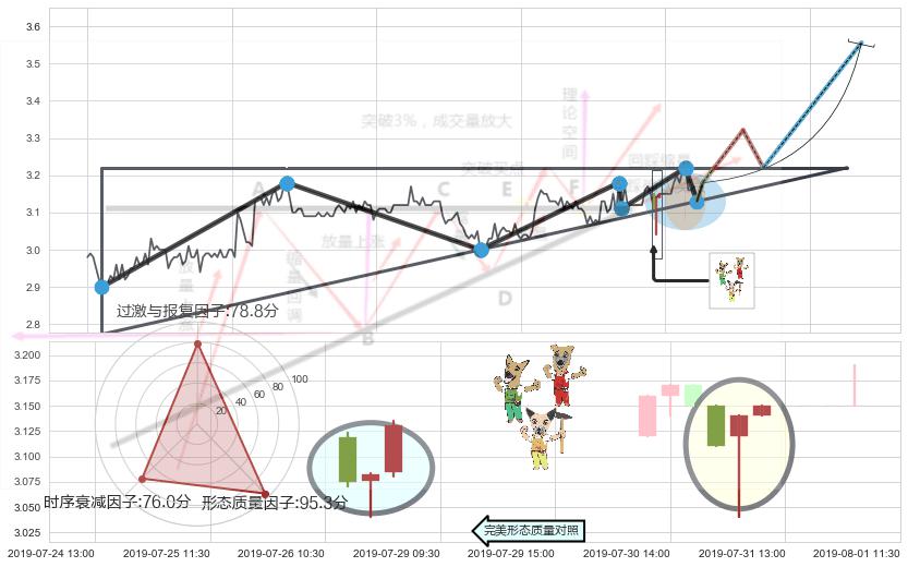 从2019-07-17 09:30至2019-08-02 15:00,共包含78个小时,阶段股价上涨6.12%,阶段股价变动位移路程比: 1 : 7,上涨趋势角度: 28.7