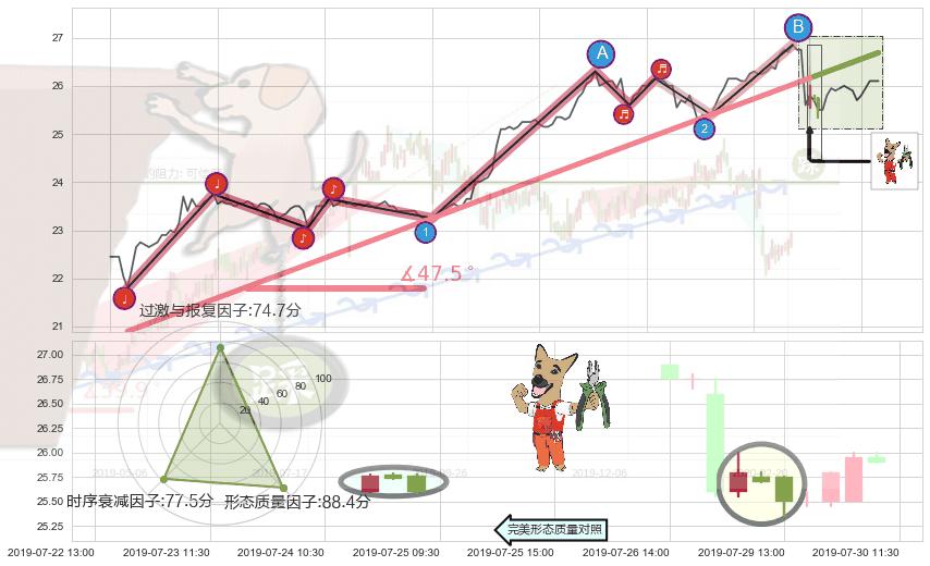 ➢ 2019-06-19 14:00-2019-07-29 11:30上升趋势存在反转[风险],其原上升趋势的支撑位(26.69)已破位[强阻力信号],原上升趋势角度: 47.5˚