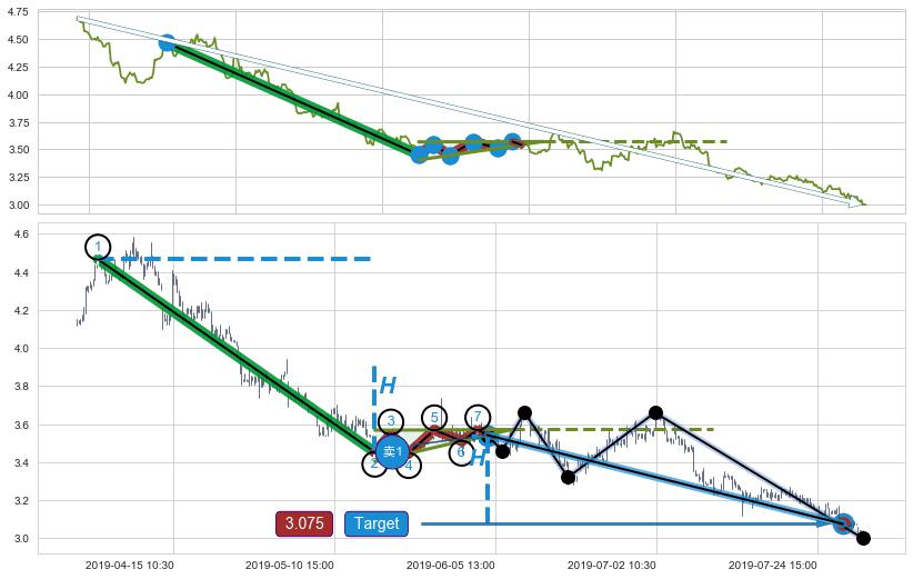 ➣ 升楔型:下跌目标target已达成:猜想强支撑位临近,预期反弹上涨(均值回复)