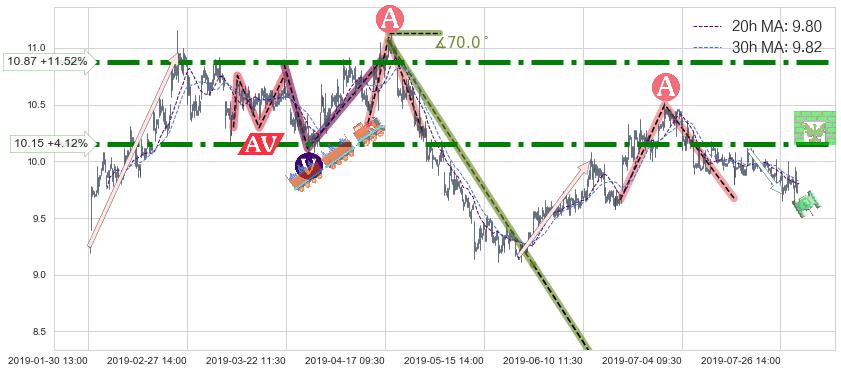 ♘ 阻力价格位10.15,可信任强度88.13%,距离最后交易2019-07-31 15:00形成的收盘价格9.75相差 +4.12%