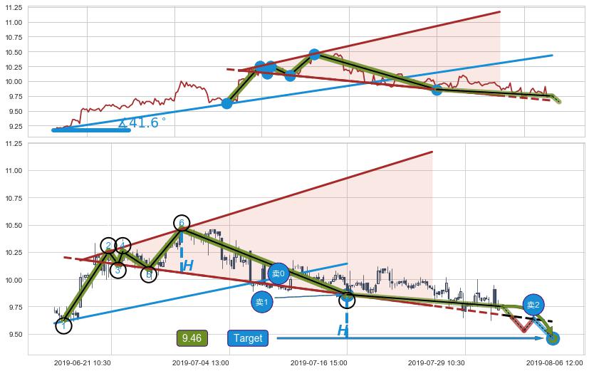 从2019-06-28 10:30至2019-07-31 09:30,共包含132个小时,阶段股价下跌-6.74%,阶段股价变动位移路程比: 1 : 6,下跌趋势角度: 38.7