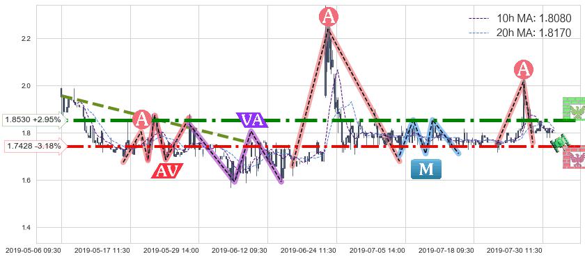 ♘ 支撑价格位1.7428,可信任强度77.56%,距离最后交易2019-07-31 15:00形成的收盘价格1.8000相差 -3.18%