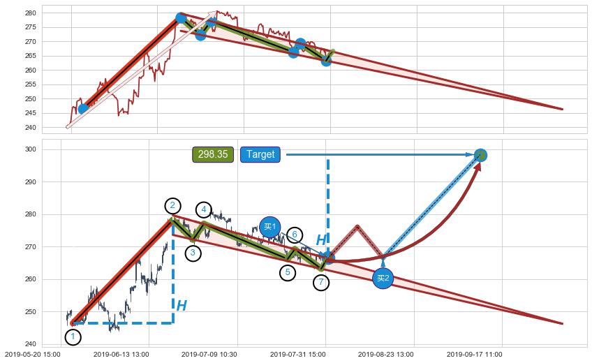 ➣ 降楔型:猜想临近关键阻力位突破点 → 临近拐点上涨 → 机会信号 → 大趋势均值回复