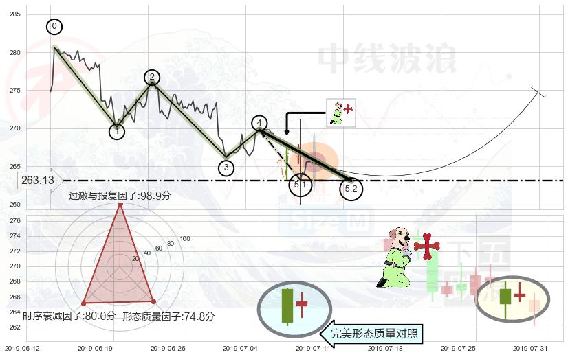 ➣ 5.1: 预测当前第5浪位置(07-31:09, 263.20),仍然有下跌空间