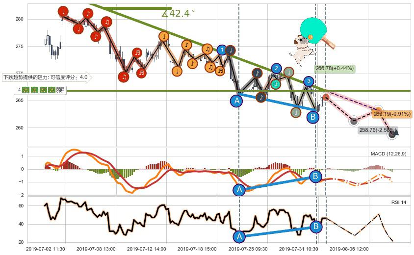 ➣ 预测:2019-08-07 11:00,【试探阻力】稳定目前下跌趋势的前提下,预测价格:263.19