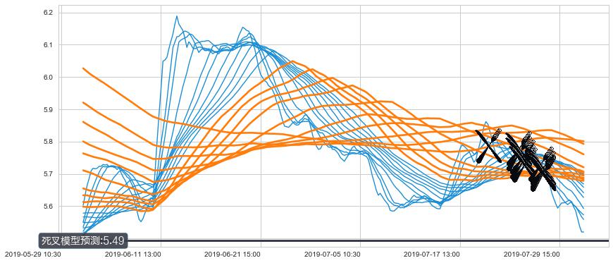 ➣ 60小时均线于(07-26 10:30: 5.73)形成【死叉】基于【死叉历史模型】预测死叉后最低波谷价格: 5.51, 死叉后最低价格5.49,虽然已经到达预测最低波谷价格,但耗时间很短动能很强, 预期继续下跌