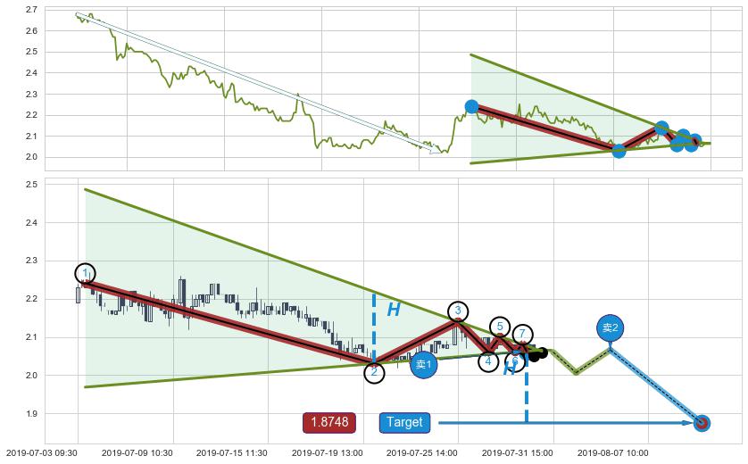 ➢ 最后的下跌趋势2019-05-14 13:00至2019-07-03 10:30:存在突破迹象,后续小反弹或者反转上涨