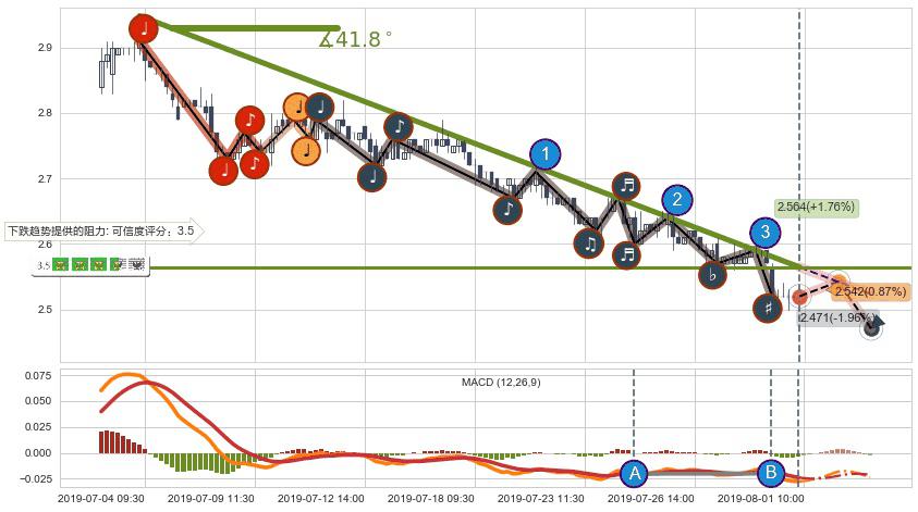 ♘ 在最后的下跌阶段2019-07-03 15:00至2019-07-31 14:00,存在 持续未破位的阻力位 ,阻力价格2.564,可信任强度80.24%,其距离最后价格2.520相差 +1.76%