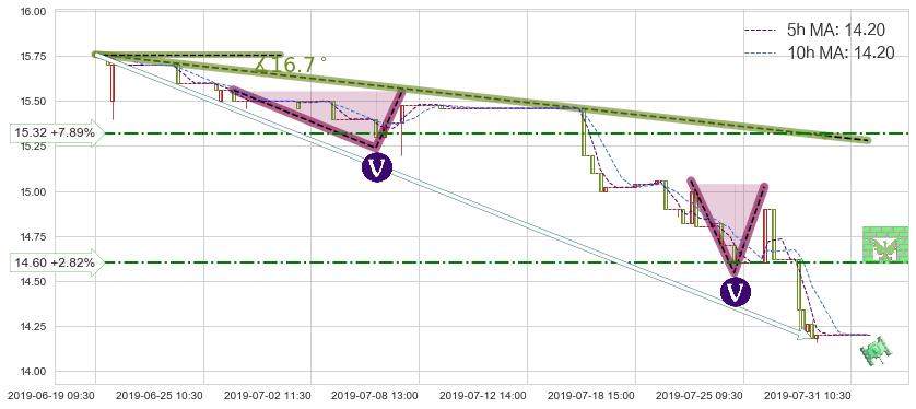 ♘ 阻力价格位14.60,可信任强度41.75%,距离最后交易2019-07-31 15:00形成的收盘价格14.20相差 +2.82%