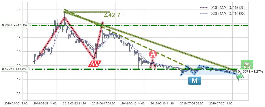 🦴 长线均值回复组合短线趋势跟踪[强阻力信号]2019-03-06 09:30-2019-07-31 15:00下跌趋势依然成立(下跌趋势跟踪依然存在),短线价格略微上行反弹(均值回复猜想),即将接近下跌趋势提供的未破位阻力价格:0.45571。