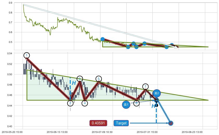 ➣ 最小中继整理跌幅→𝐇: 0.0440865 (下侧直角边第一支撑点②与斜边垂直距离)