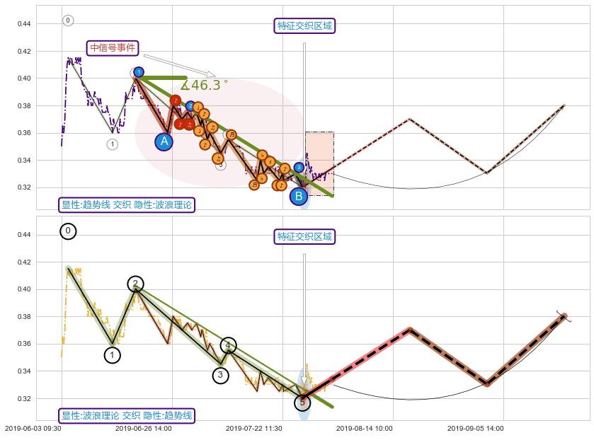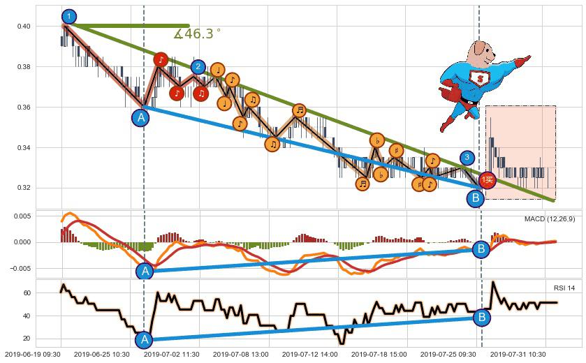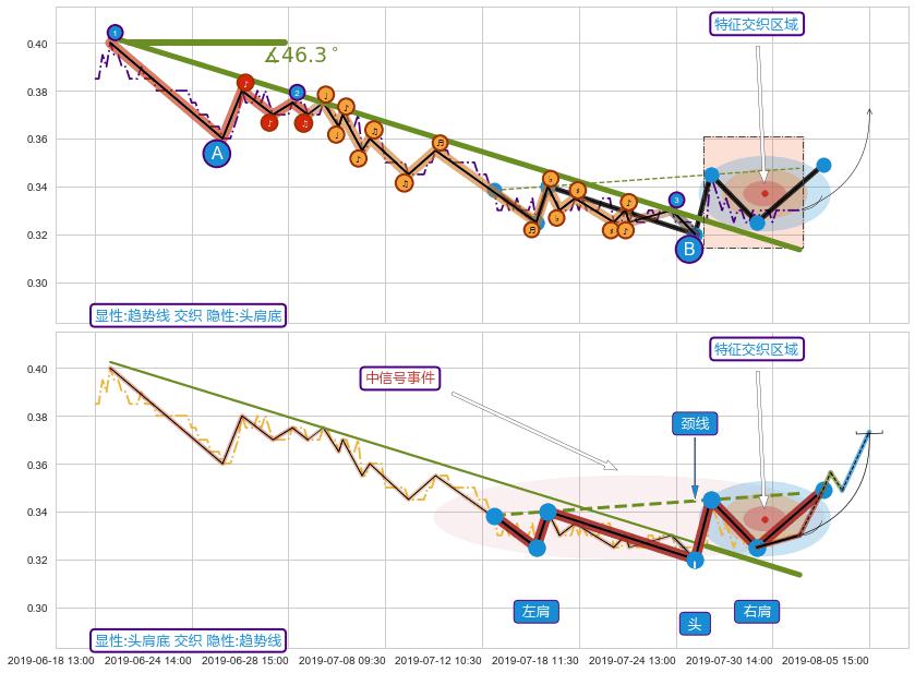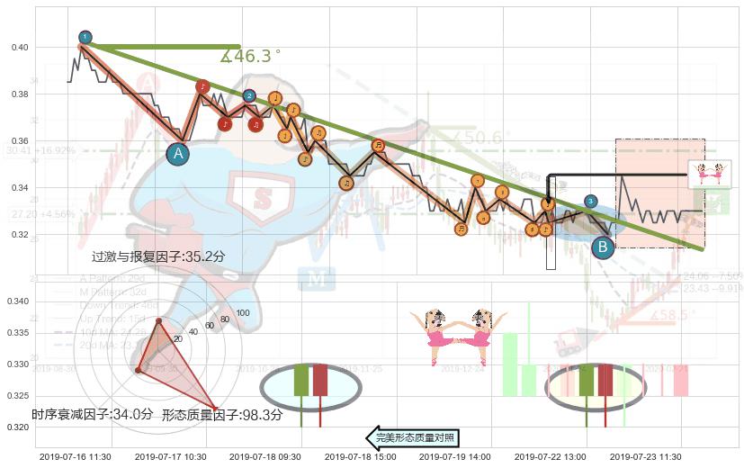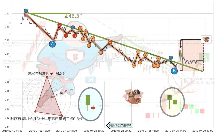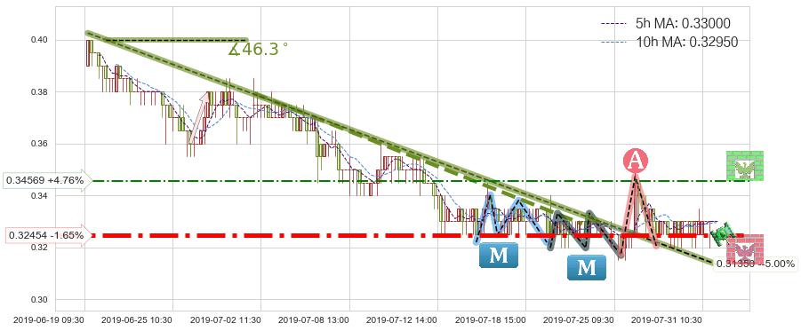 ➢ 2019-06-19 10:30-2019-07-25 15:00下跌趋势存在反转上涨[机会],其原下跌趋势的阻力位(0.31350)已被突破[强支撑信号],原下跌趋势角度: 46.3˚