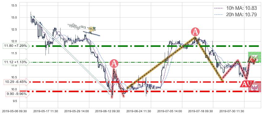 ♘ 阻力价格位11.80,可信任强度88.54%,距离最后交易2019-07-31 15:00形成的收盘价格11.00相差 +7.29%