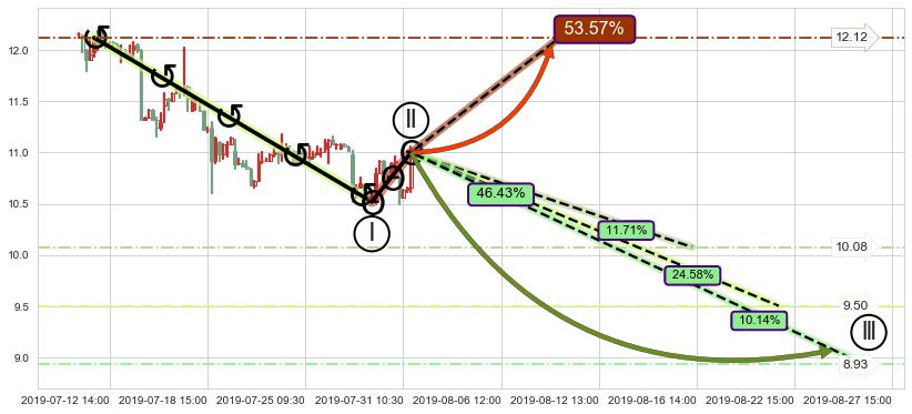 从2019-07-22 14:00至2019-07-31 15:00,共包含44个小时,阶段股价上涨3.23%,阶段股价变动位移路程比: 1 : 8