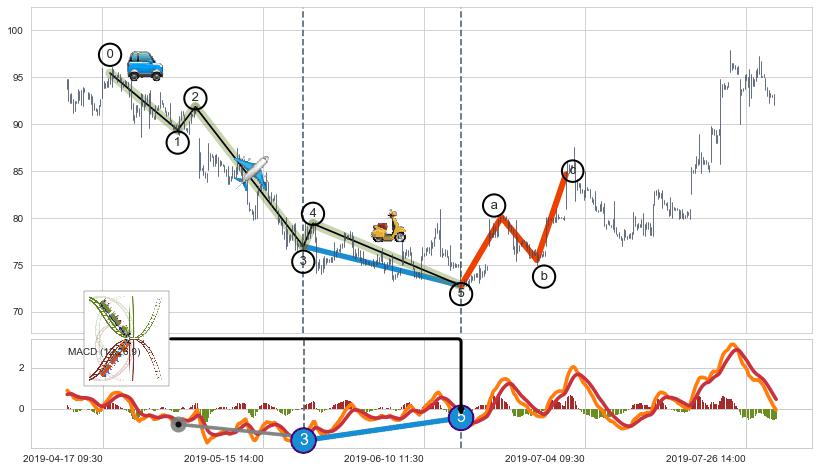 从2019-05-23 10:30至2019-06-14 10:30,共包含91个小时,阶段股价下跌-2.08%,阶段股价变动位移路程比: 1 : 24