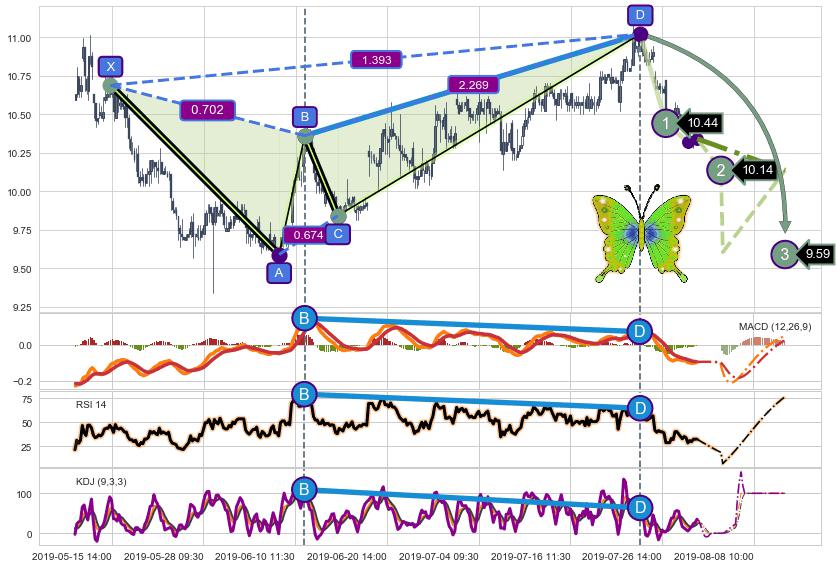 ➣ 谐波蝴蝶:已到达d点:猜想c拉升到达d点后泄力性下沉下跌(均值回复)