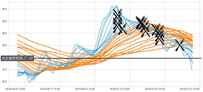➢ 70小时均线于(07-15 15:00: 28.88)形成【死叉】基于【死叉历史模型】预测死叉后最低波谷价格: 27.83, 死叉后最低价格26.90,已经下跌超出预测最低波谷价格, 预期反弹