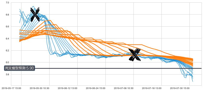 ➢ 50小时均线于(07-08 09:30: 6.13)形成【死叉】基于【死叉历史模型】预测死叉后最低波谷价格: 5.88, 死叉后最低价格5.60,已经下跌超出预测最低波谷价格, 预期反弹