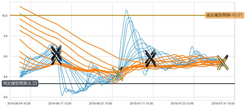 ➢ 55小时均线于(06-12 11:30: 8.95)形成【死叉】基于【死叉历史模型】预测死叉后最低波谷价格: 8.38, 死叉后最低价格7.92,已经下跌超出预测最低波谷价格, 预期反弹