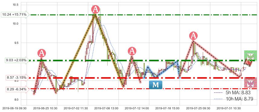 ♘ 阻力价格位9.03,可信任强度88.76%,距离最后交易2019-07-31 15:00形成的收盘价格8.85相差 +2.03%