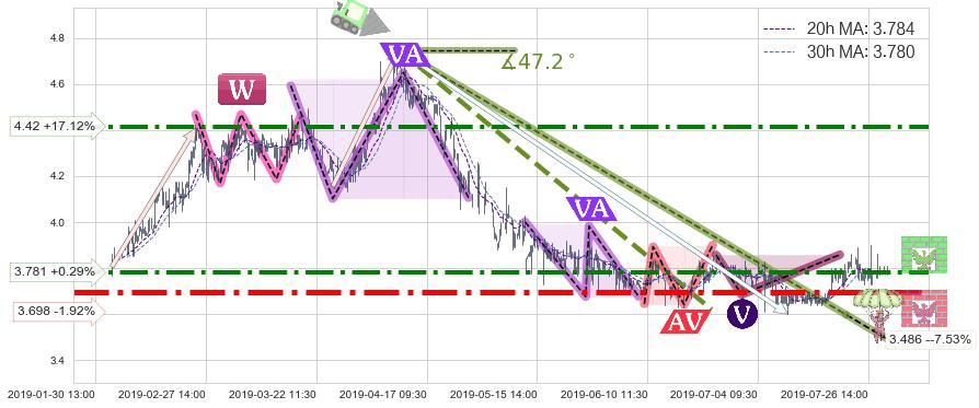 ♘ 支撑价格位3.698,可信任强度92.64%,距离最后交易2019-07-31 15:00形成的收盘价格3.770相差 -1.92%