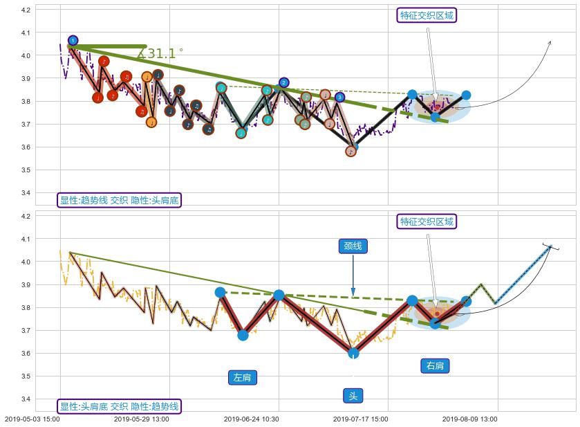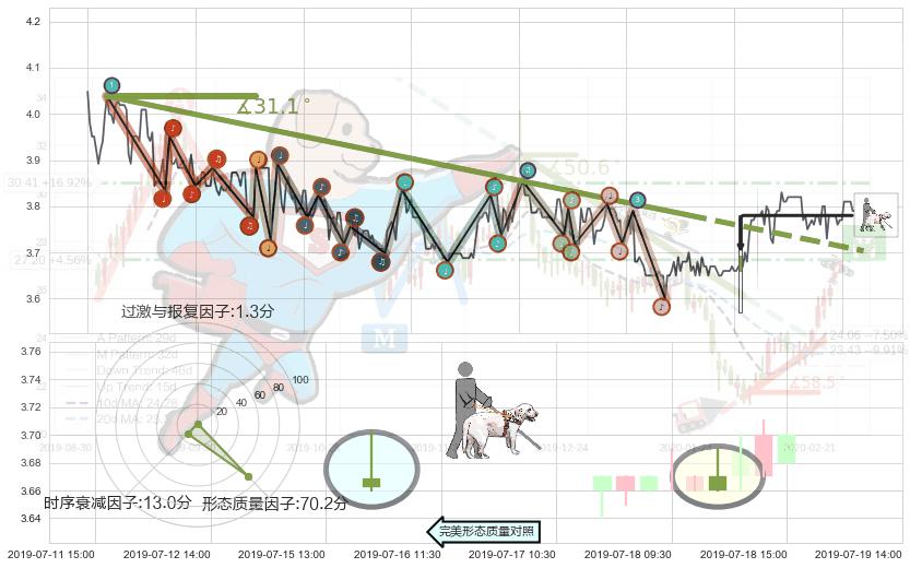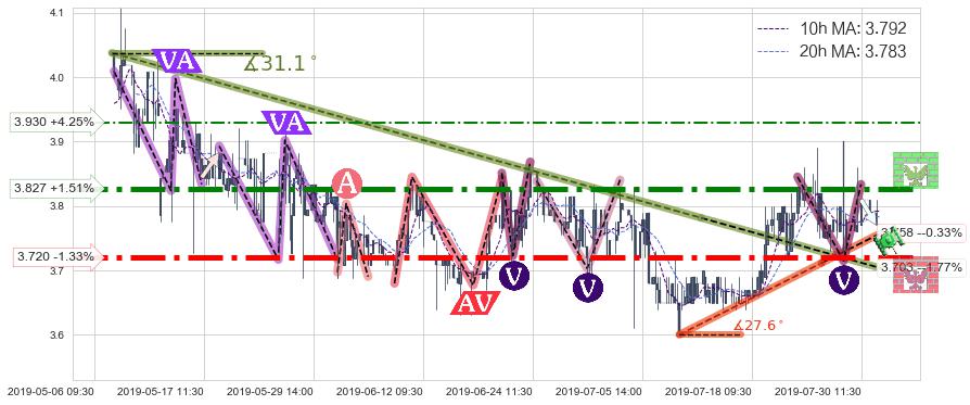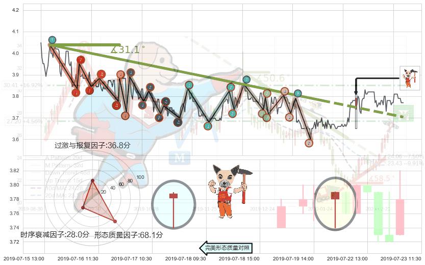 ➢ 2019-05-07 11:30-2019-07-12 10:30下跌趋势存在反转上涨[机会],其原下跌趋势的阻力位(3.703)已被突破[强支撑信号],原下跌趋势角度: 31.1˚