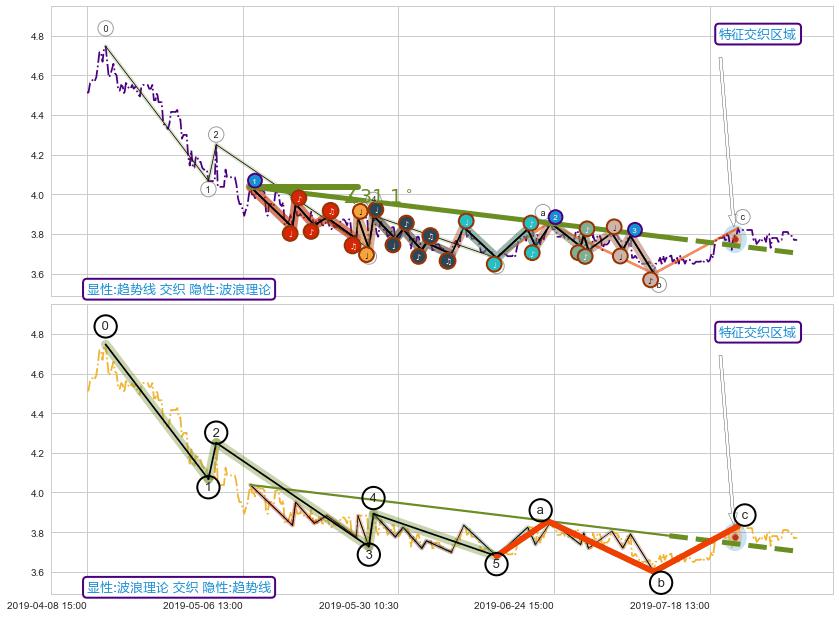从2019-05-20 13:00至2019-05-31 13:00,共包含55个小时,阶段股价下跌-3.82%,阶段股价变动位移路程比: 1 : 9