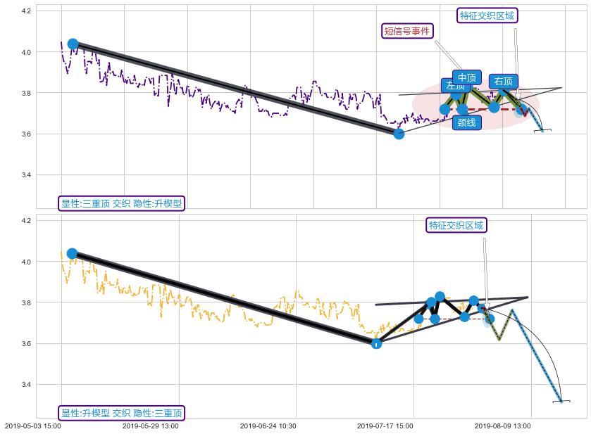 ➢ 三重顶属【短级别信号事件】升楔型属【长级别信号事件】长短周期组合信号事件, 短长事件长度比19.32%