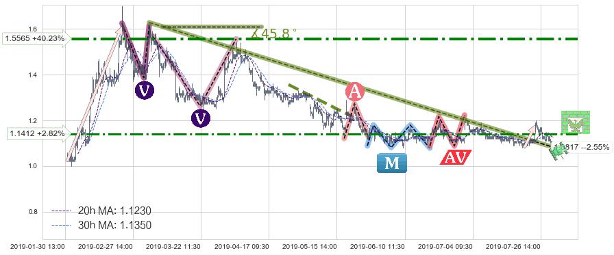 从2019-03-05 14:00至2019-07-25 10:30,共包含568个小时,阶段股价下跌-28.09%,阶段股价变动位移路程比: 1 : 17,下跌趋势角度: 45.8